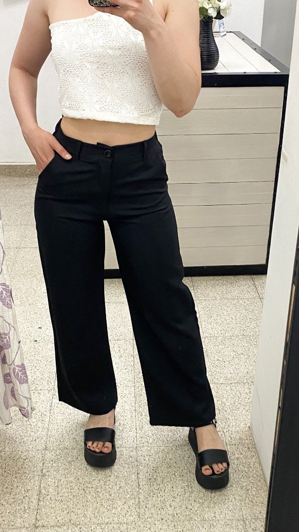 Pantalón sastrero de crepe rigido(NO se estira), tiene elástico en la cintura (en la parte de atrás ) bolsillos,boton,cierre y para pasar el cinto.