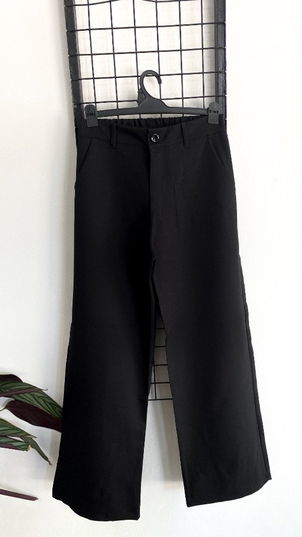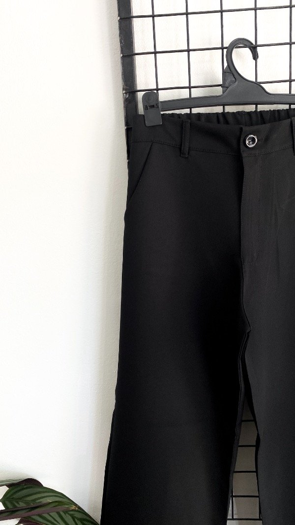 Pantalón sastrero de crepe rigido(NO se estira), tiene elástico en la cintura (en la parte de atrás ) bolsillos,boton,cierre y para pasar el cinto.