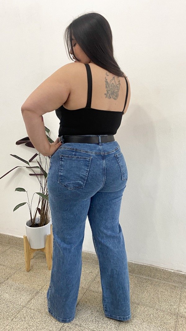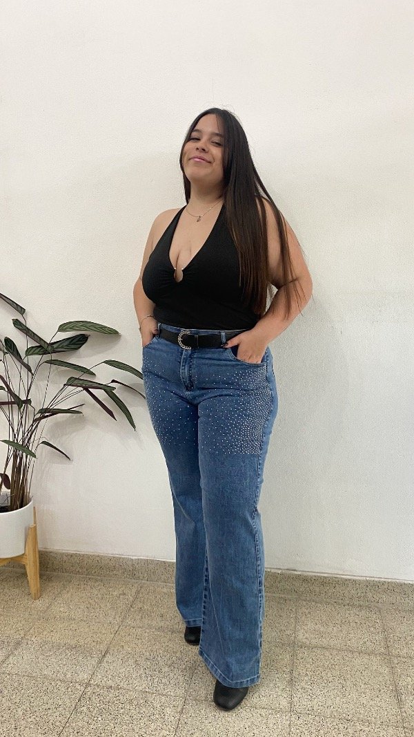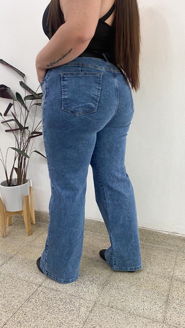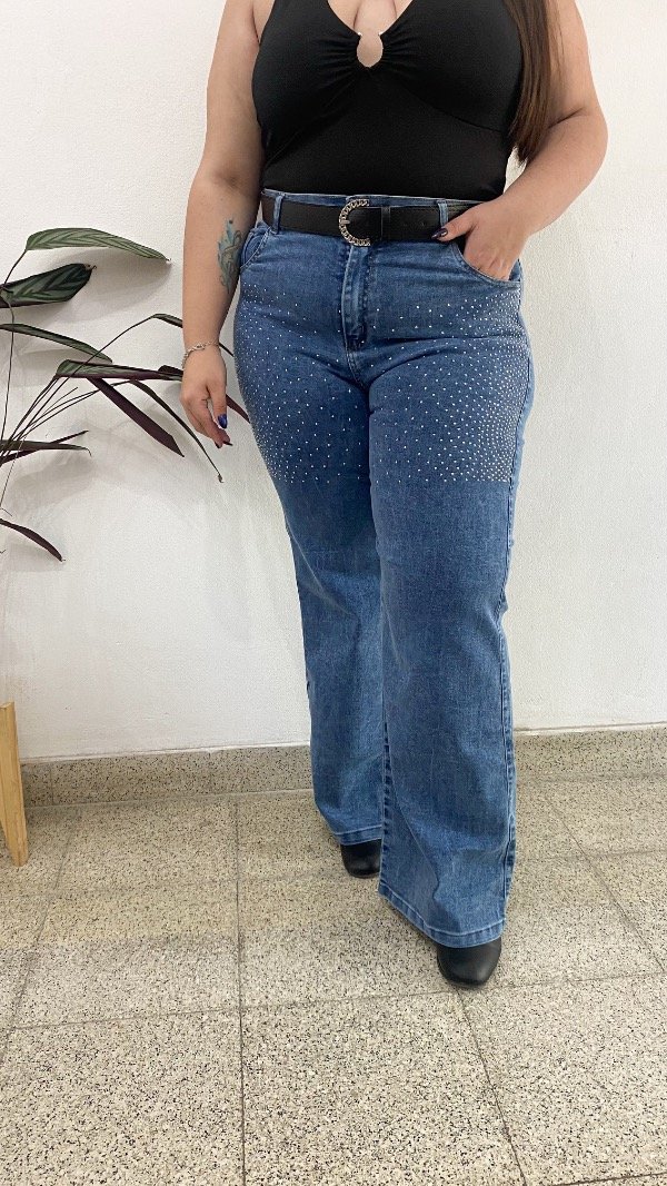 Jean wide leg con strass,elastizado.Tiro alto. La modelo tiene un talle 50