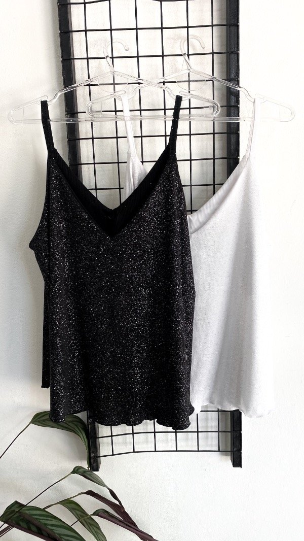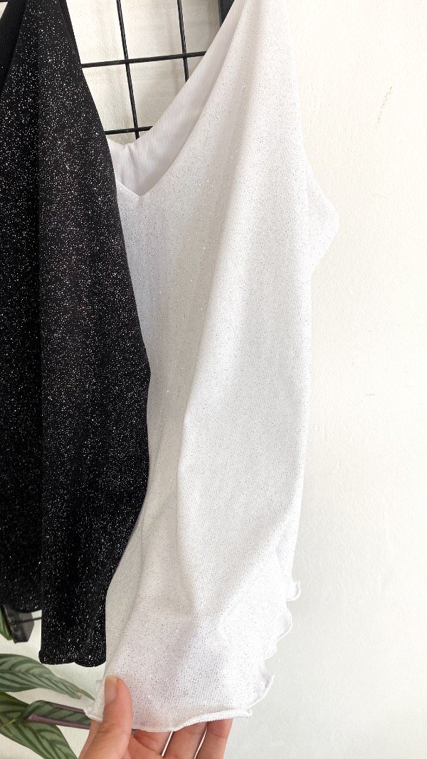 Musculosa suelta de glitter. Es elastizada. Tiene doble tela en el busto