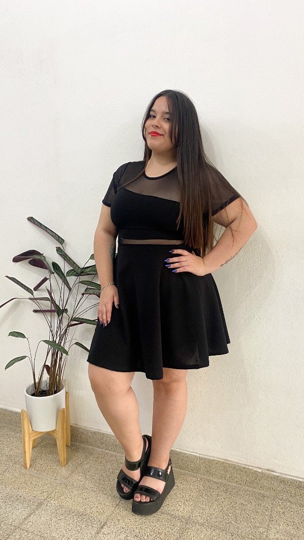 Vestido de crepe elastizado. La modelo usa un talle 6.